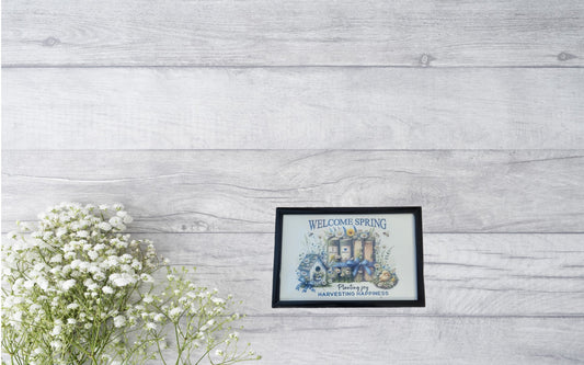 Welcome Spring Framed Art – Farmhouse Spring Decor with Books, Birdhouse & Flowers