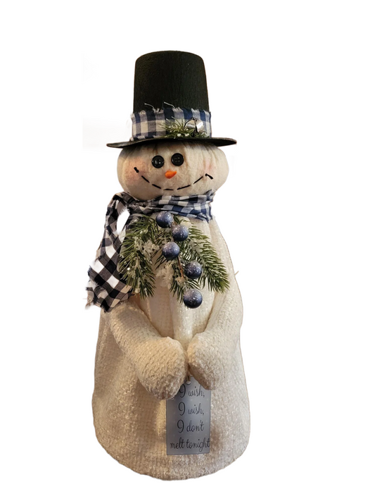 Handmade Snowman Decor with Plaid Scarf and Top Hat – "I Wish I Don't Melt" Sign