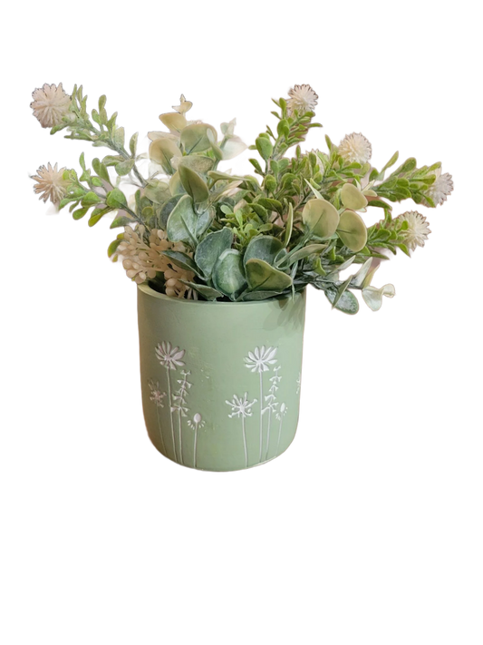Green Floral Planter with Faux White Flowers – Decorative Farmhouse Tabletop Pot