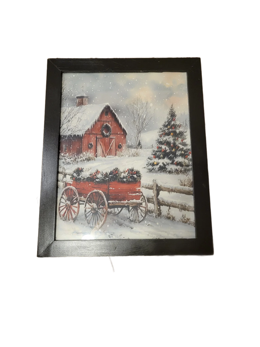 Rustic Winter Farmhouse Wall Art – Snowy Red Barn & Christmas Tree Framed Holiday Decor