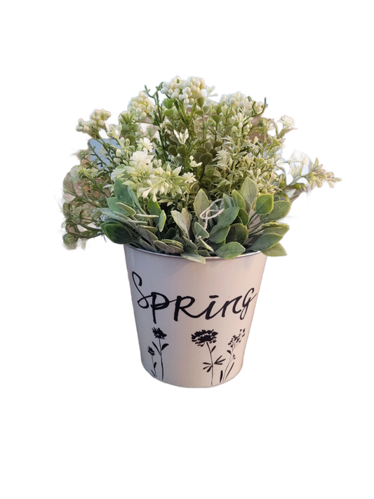 Spring Floral Decor Metal Planter with Faux Greenery – White Farmhouse Flower Pot
