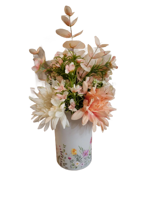 White Floral Vase with Peach & Pink Faux Flowers – Decorative Tabletop Flower Arrangement