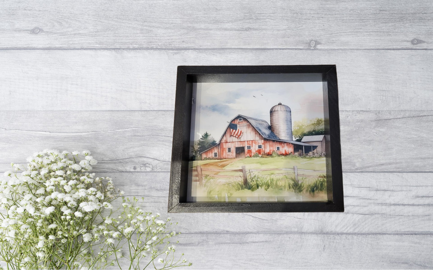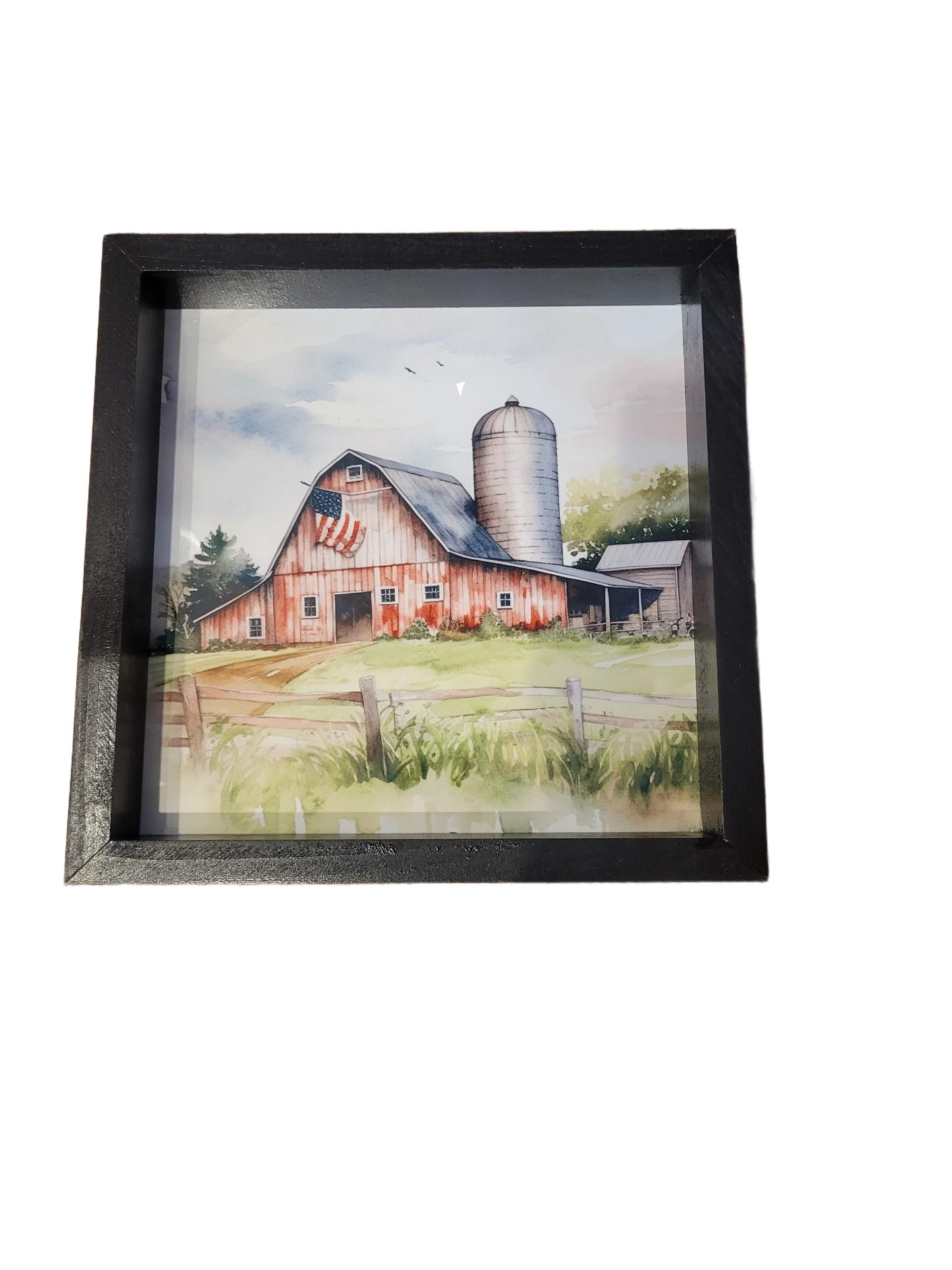 This red barn has a flag at the top of the barn in a picturesque farm setting. Black frame surrounds outside of the picture. Measures 12" x 12" x 1.5" approx. Comes with sawtooth hanger for easy display.