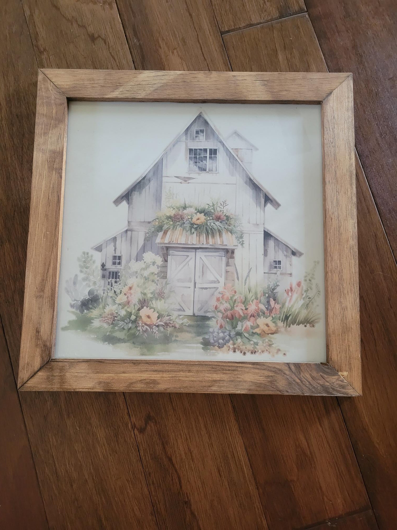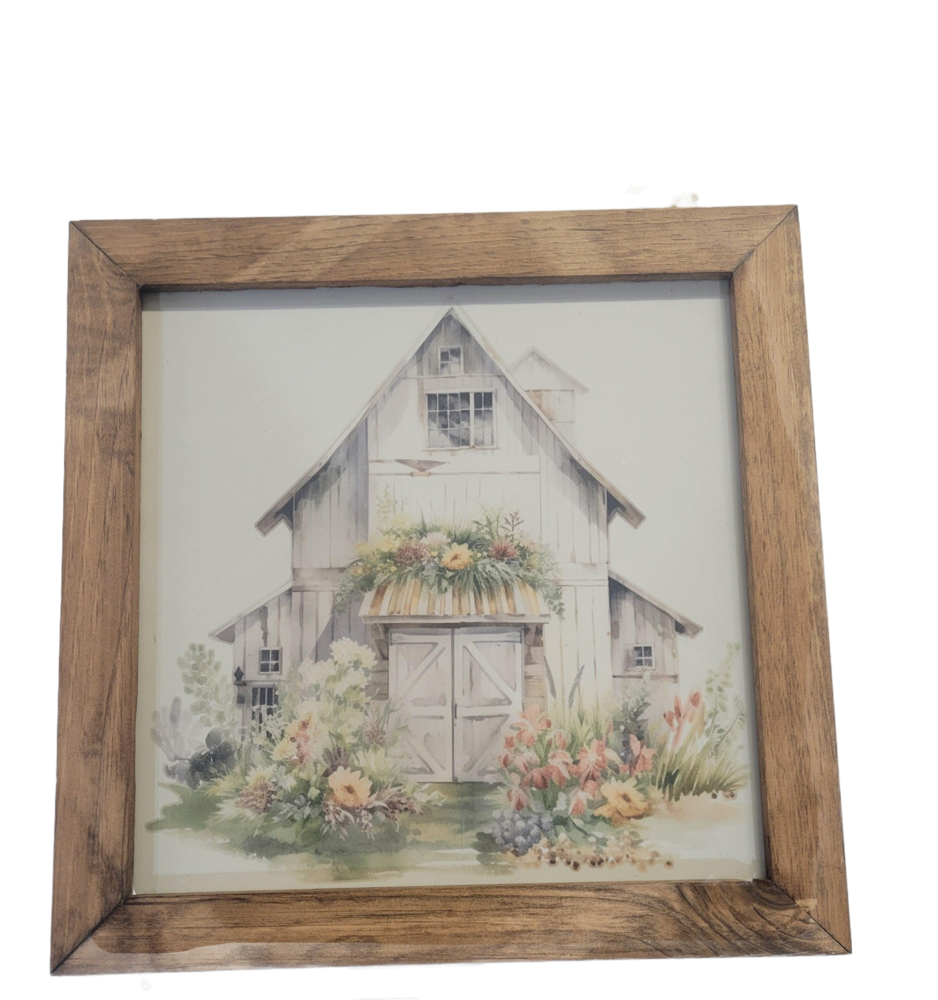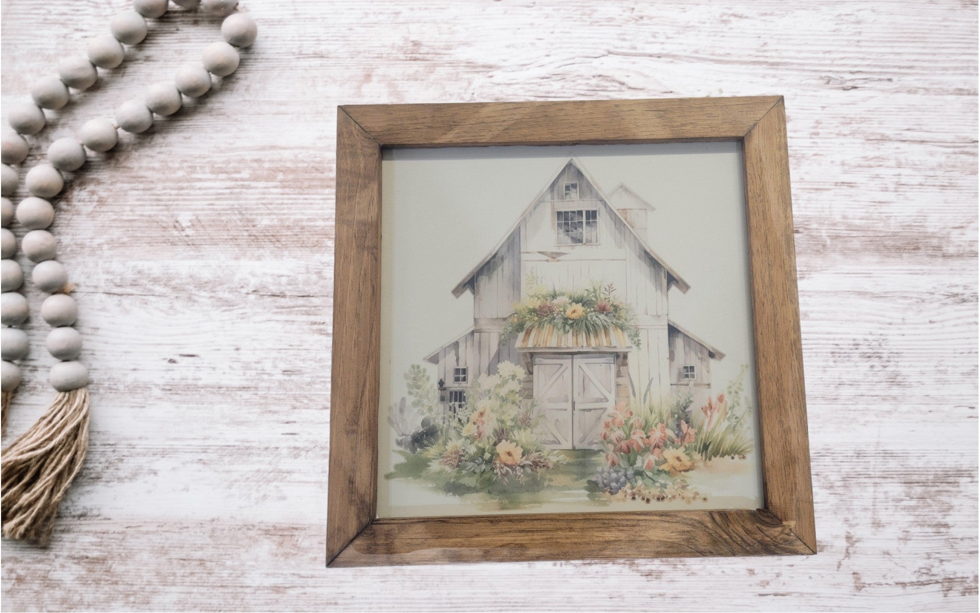Floral Barn Framed Wall Art – Rustic Watercolor Farmhouse Print with Flowers (Wood Frame)