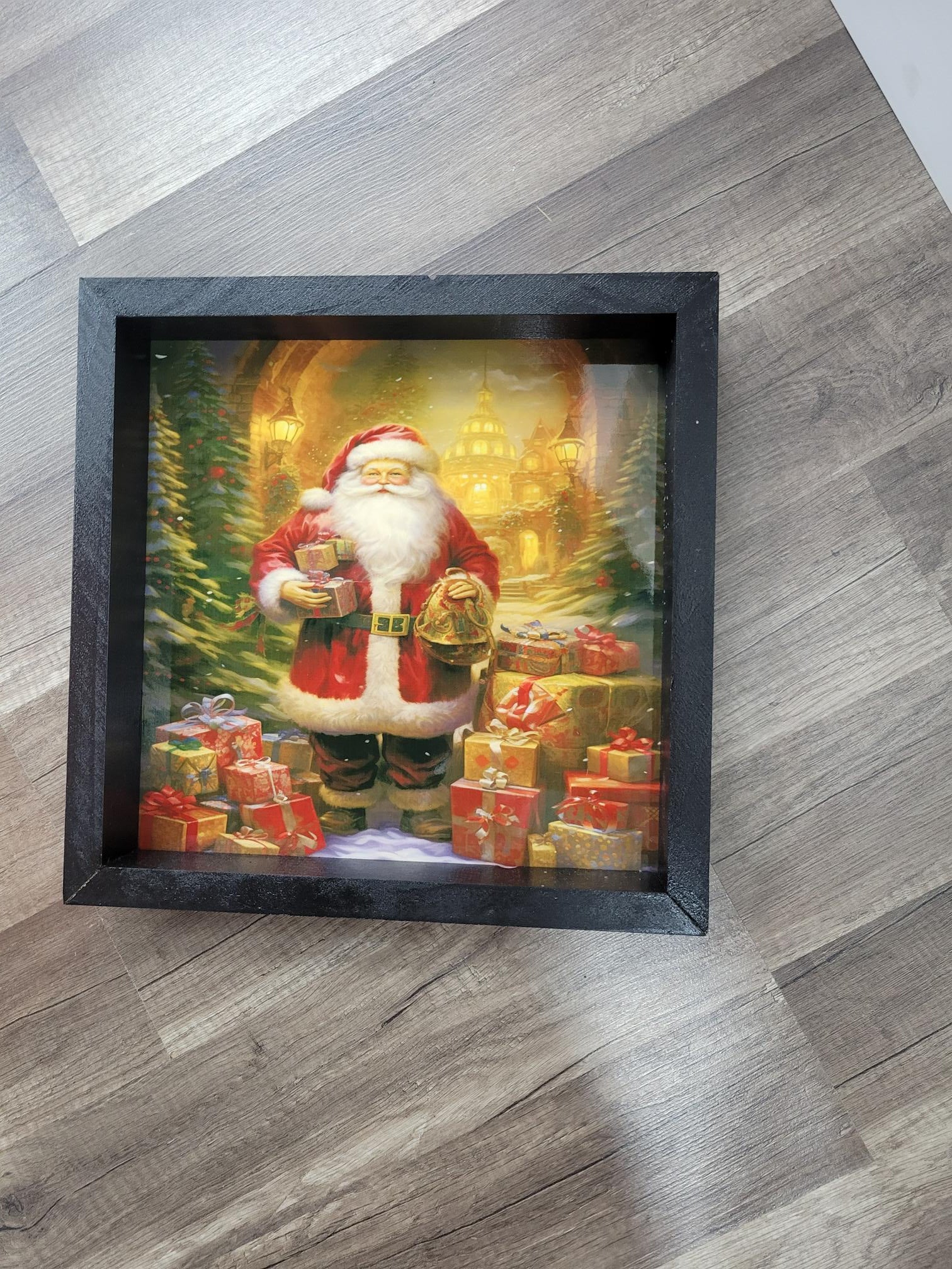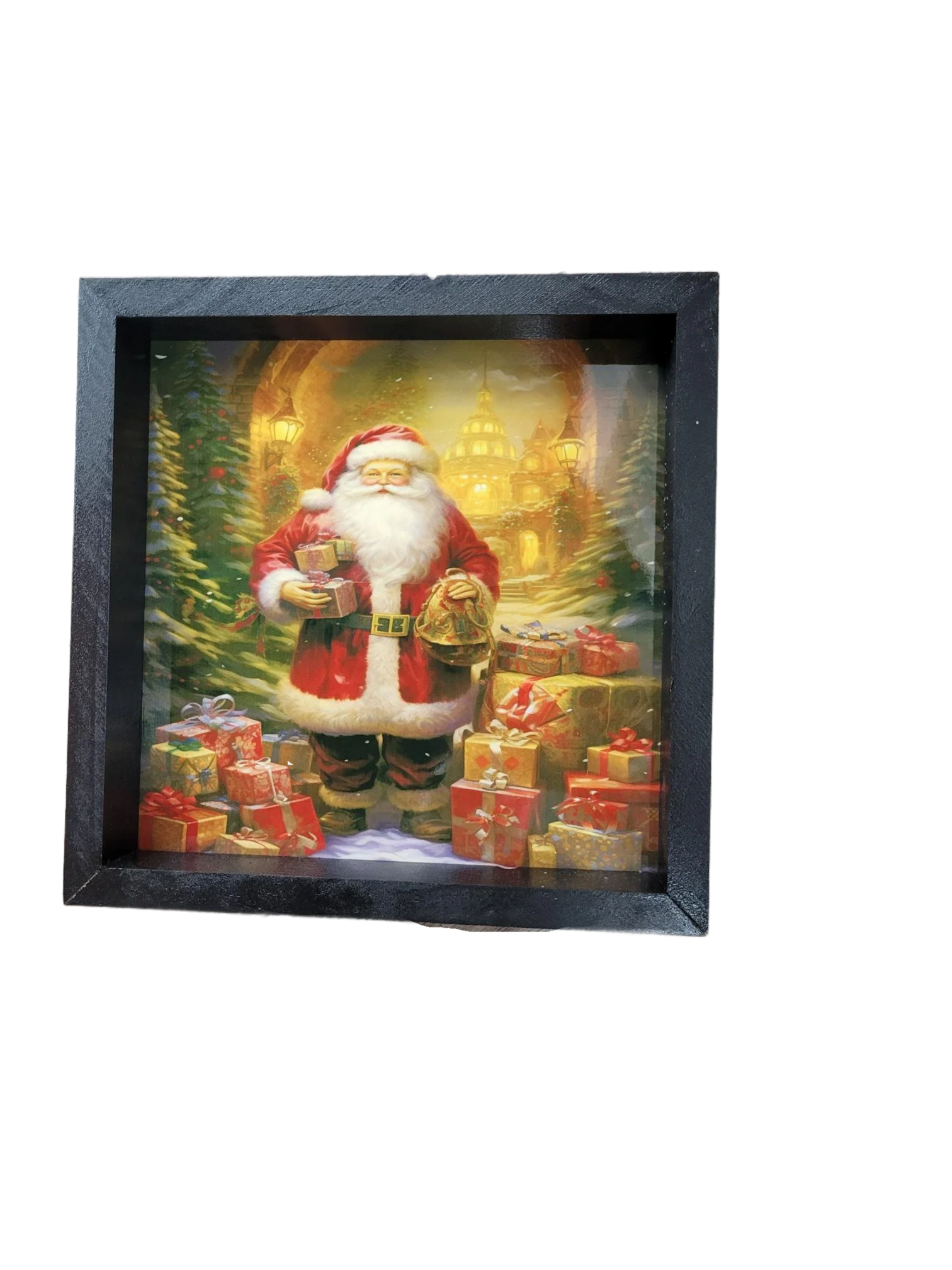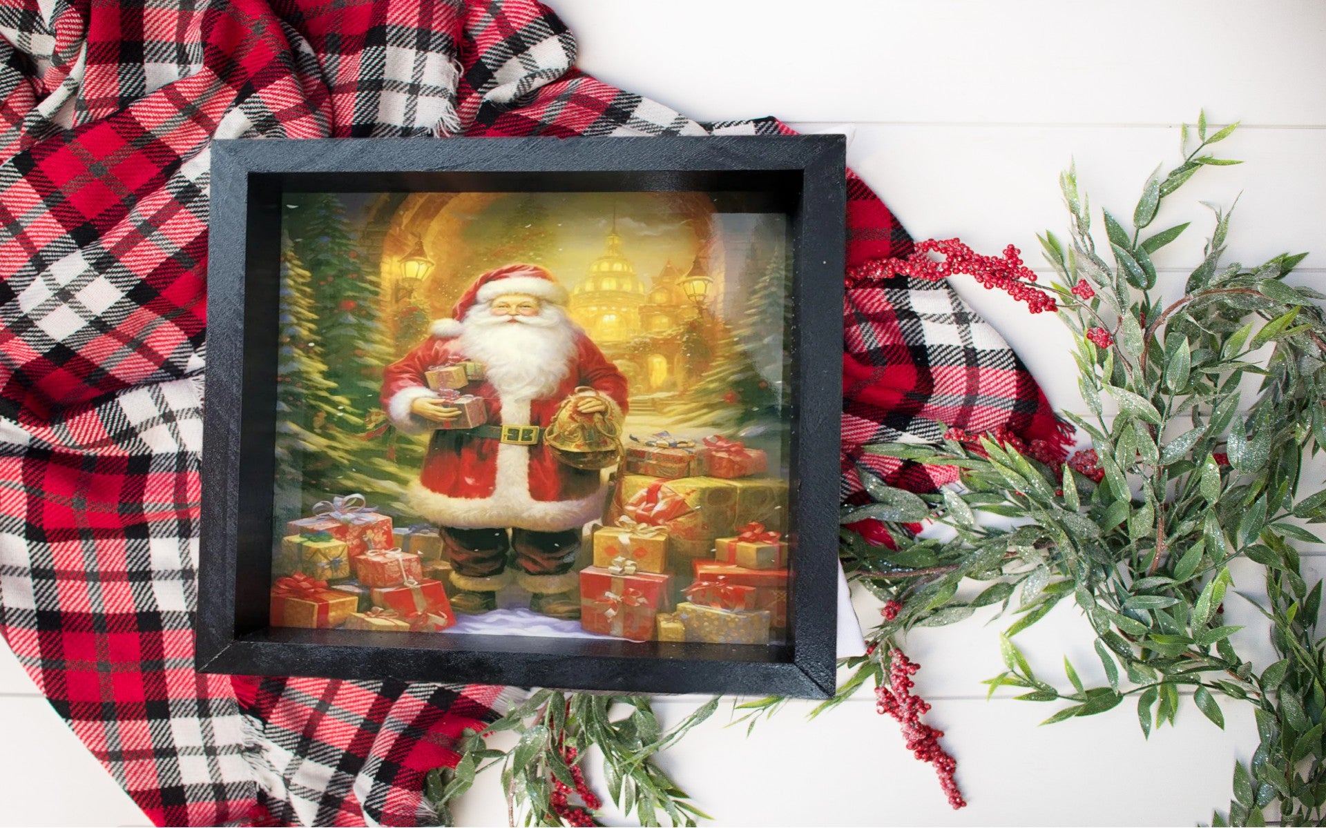 Framed Santa Claus Christmas Art with Presents - Festive Holiday Wall Decor