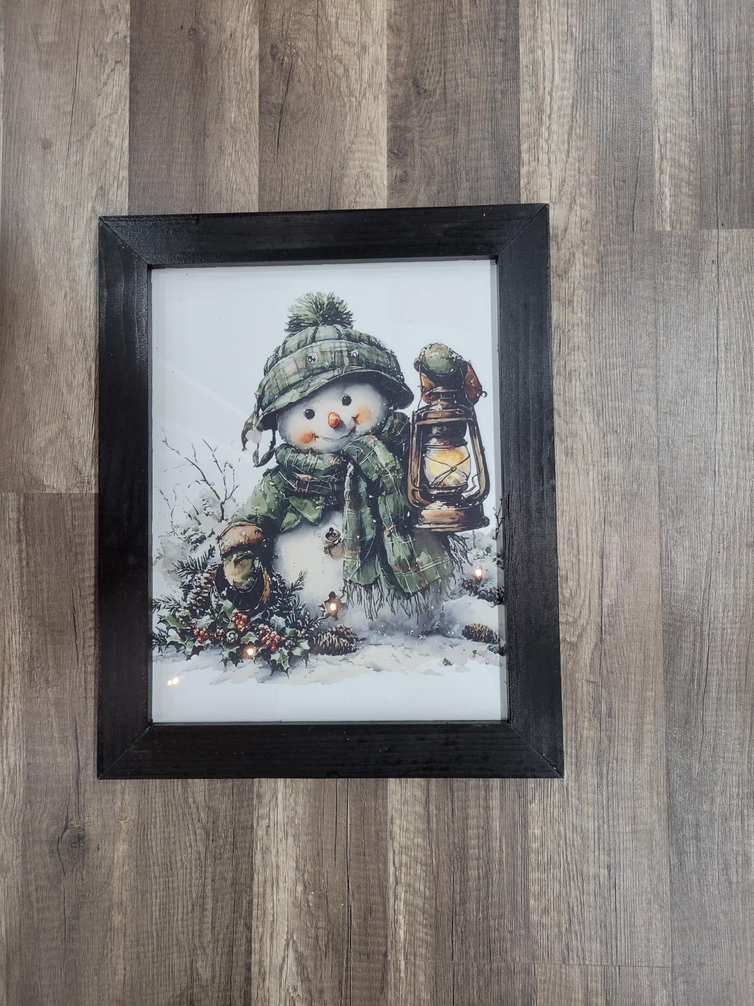 Add cozy winter charm to your home with this framed snowman wall art featuring a cheerful snowman holding a glowing lantern. Designed in a rustic farmhouse style with soft winter greenery, this decorative piece is perfect for Christmas and winter home décor. The black wood frame adds a timeless finish, making it ideal for living rooms, entryways, kitchens, or holiday displays. A beautiful seasonal accent that brings warmth, nostalgia, and festive cheer to any space. Measures 11" x 14" approx