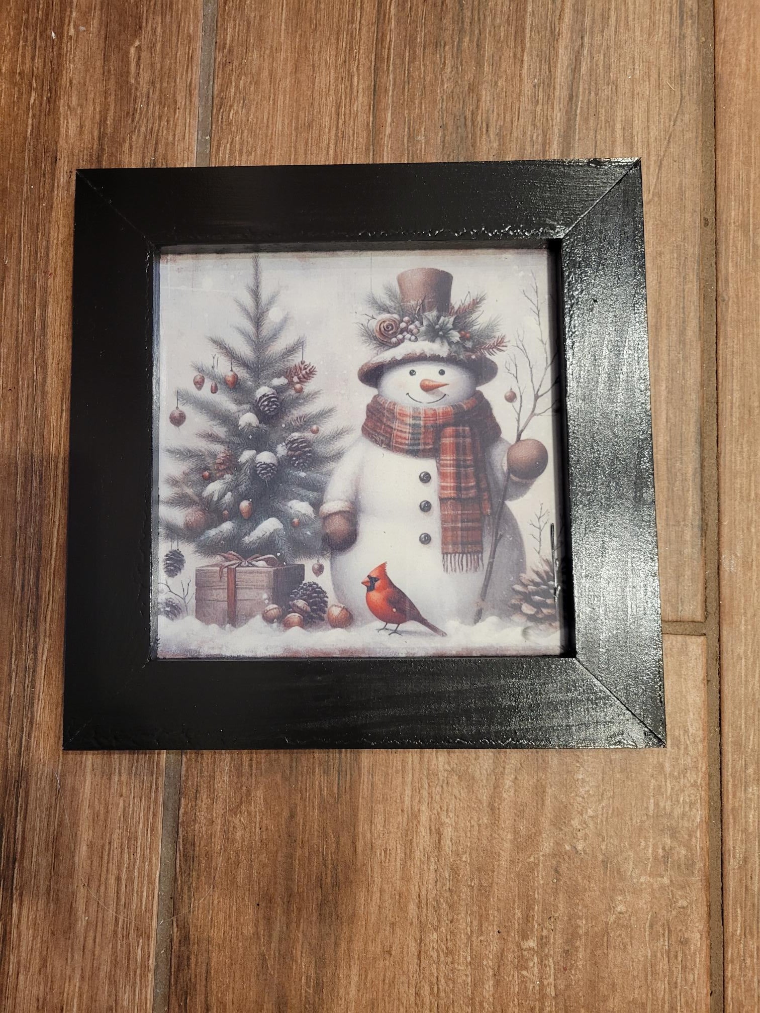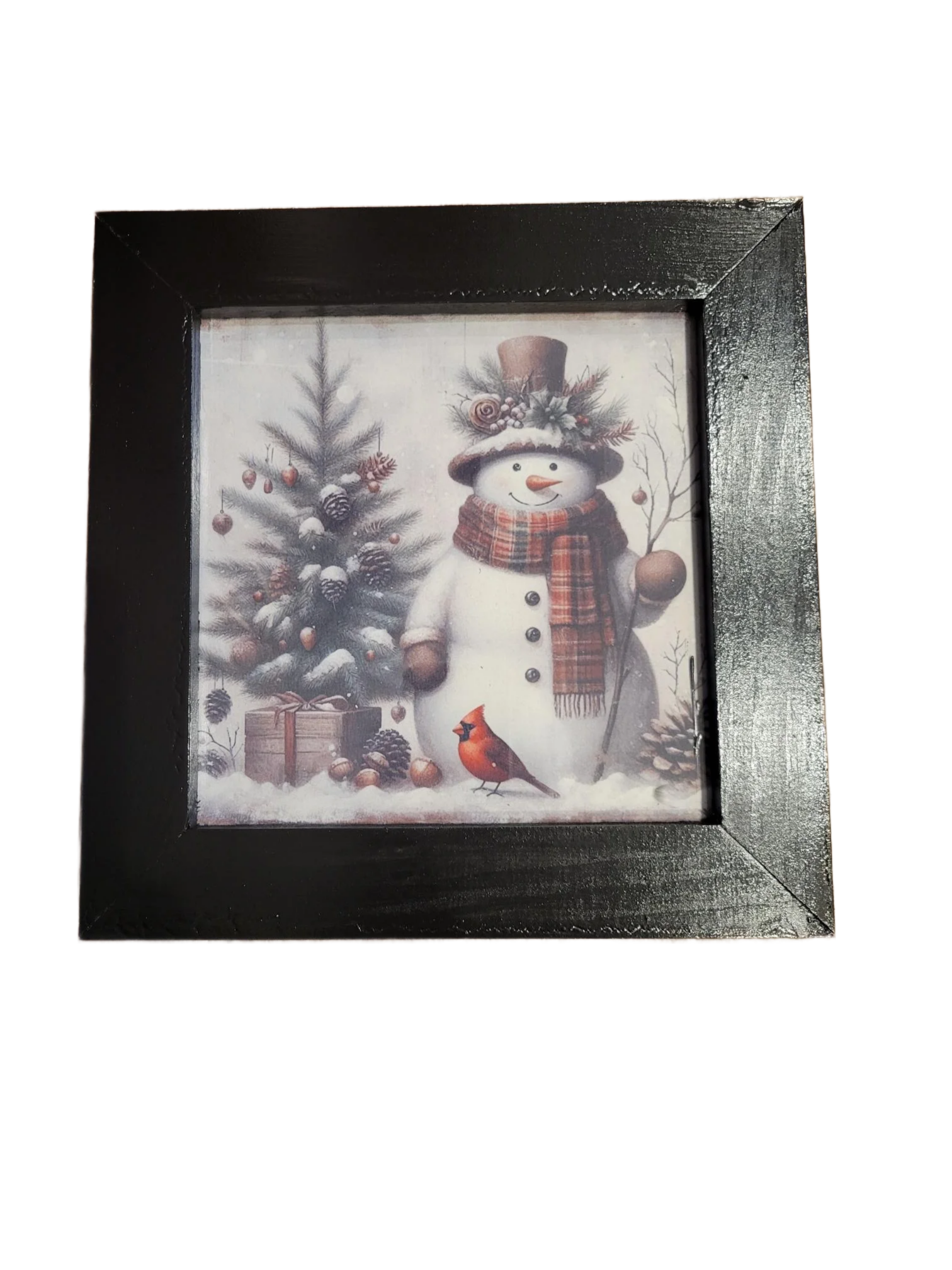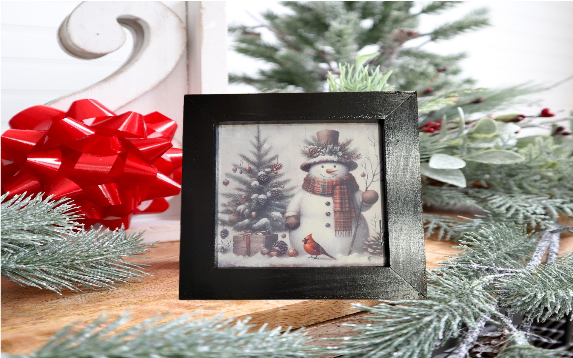 Bring cozy holiday charm to your space with the framed snowman art print. Featuring a cheerful snowman, Christmas Tree, gifts and cardinal bird, this rustic winter scene is perfect for seasonal home decor. Measures 10.5" x 10.5"