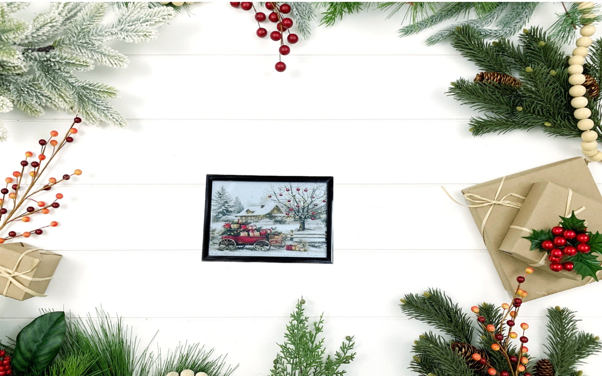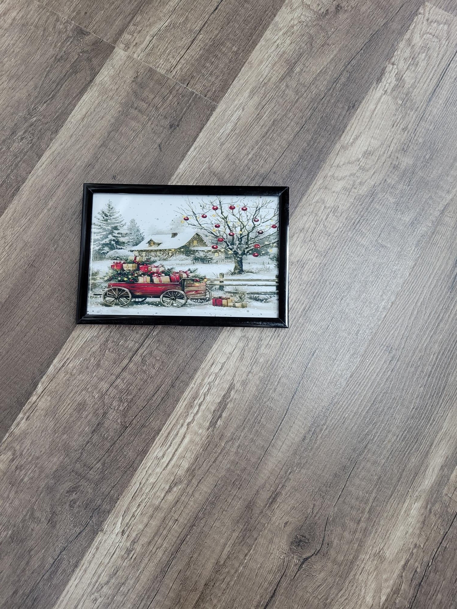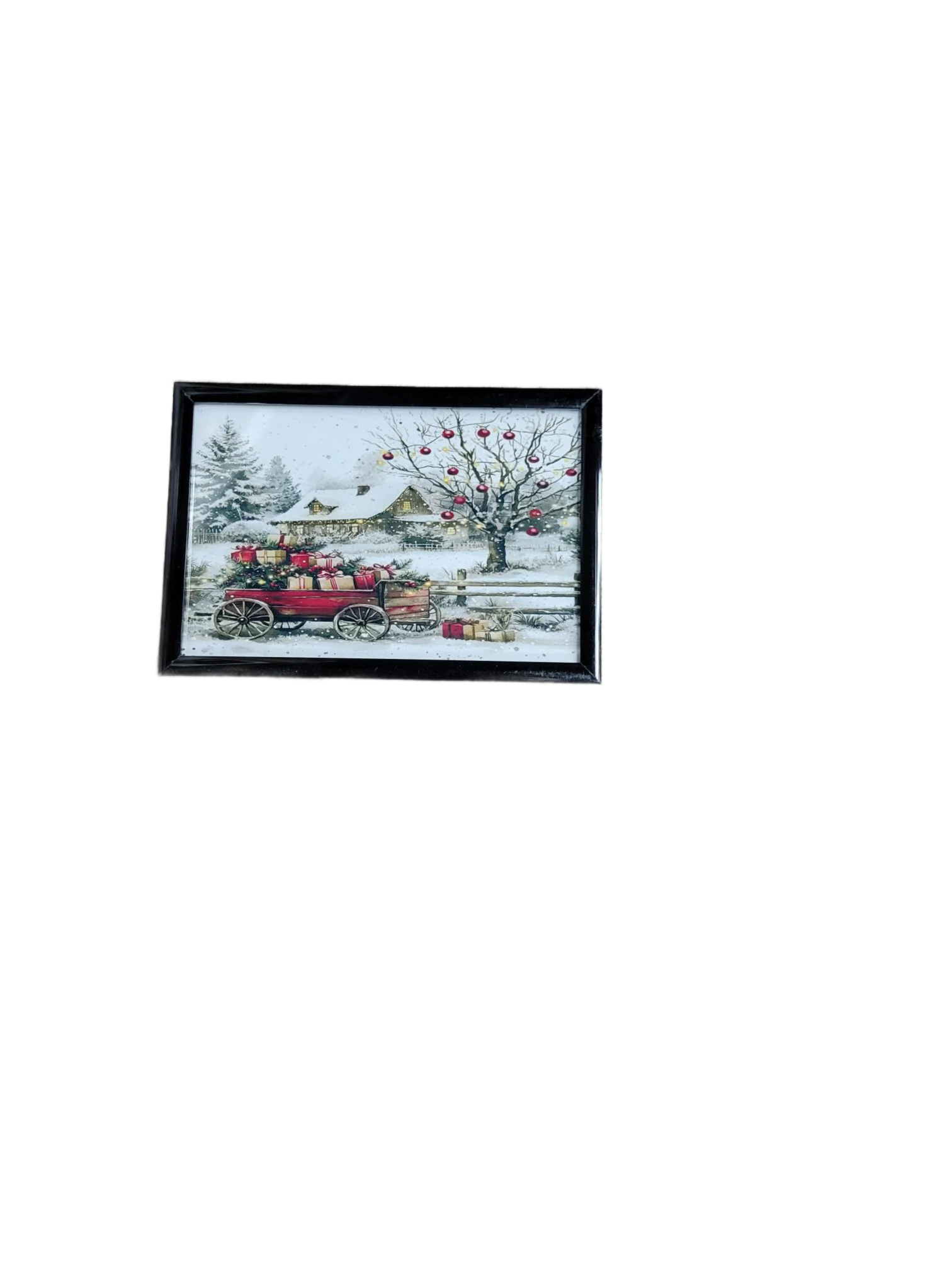 Celebrate the season with this framed vintage Christmas artwork featuring a red wagon filled with presents, a snowy farmhouse , and a festive tree adorned with ornaments. Perfect for rustic holiday decor, this charming winter scene add a nostalgic touch to any room or seasonal display.