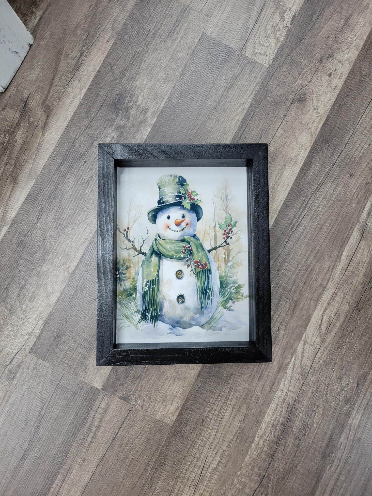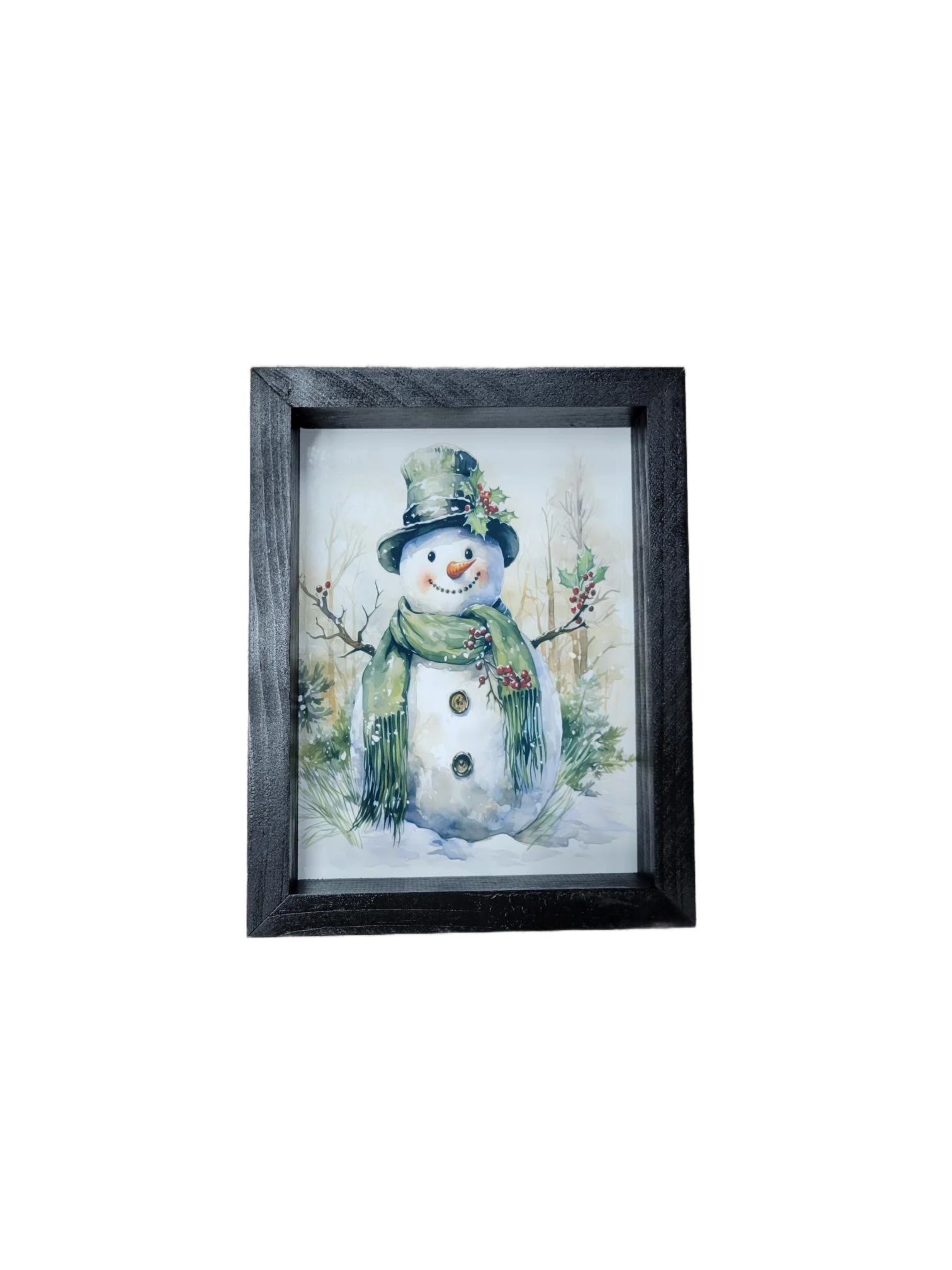 Charming 8x10 snowman print in black frame, perfect for winter or Christmas decor. Features green hat and scarf with holly accents.