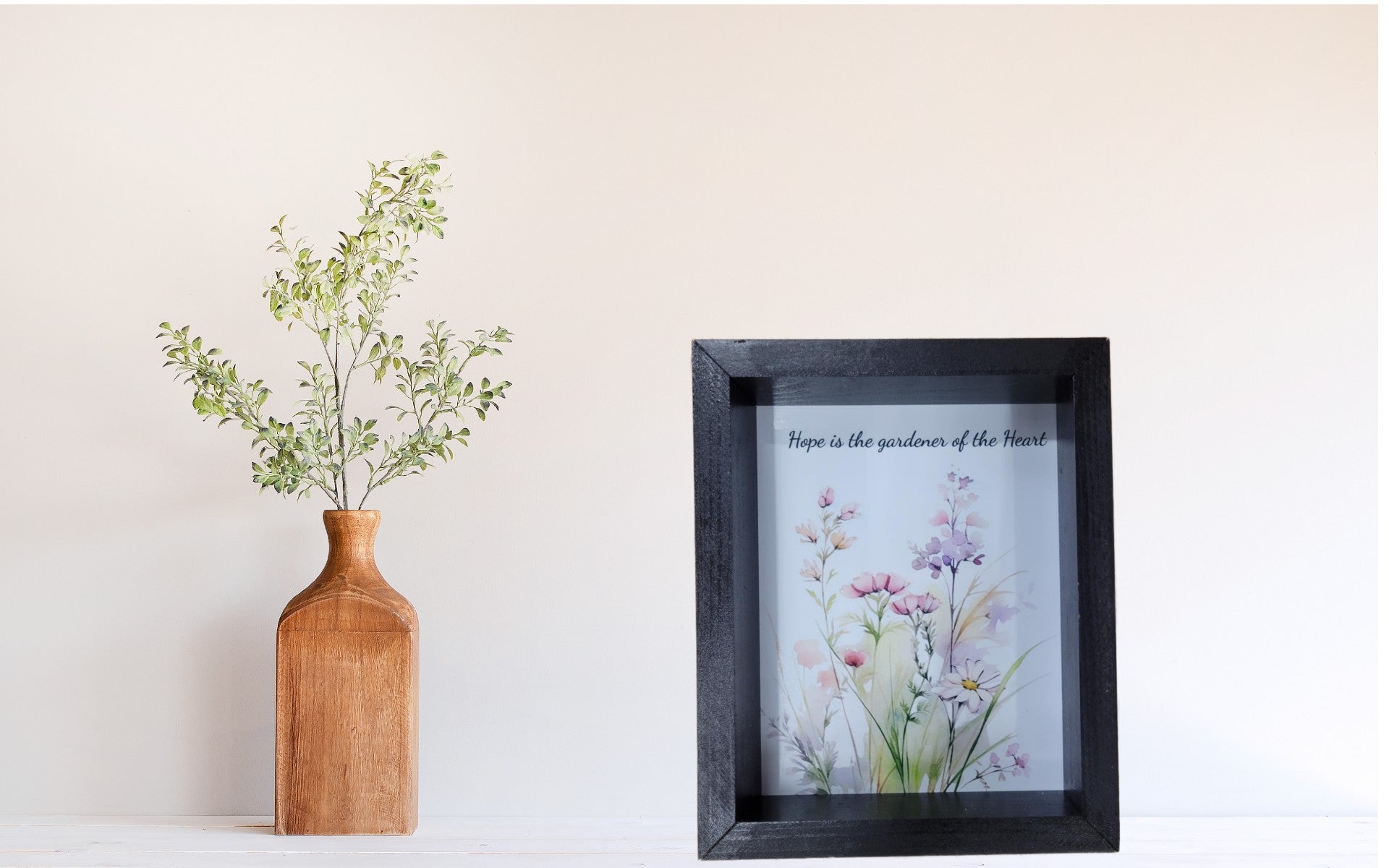 Framed floral wall art with 'Hope is the gardener of the Heart' quote. A beautiful, inspiring piece for home decor, gifts, and nature-themed spaces