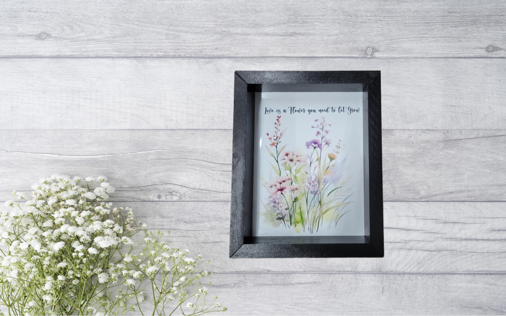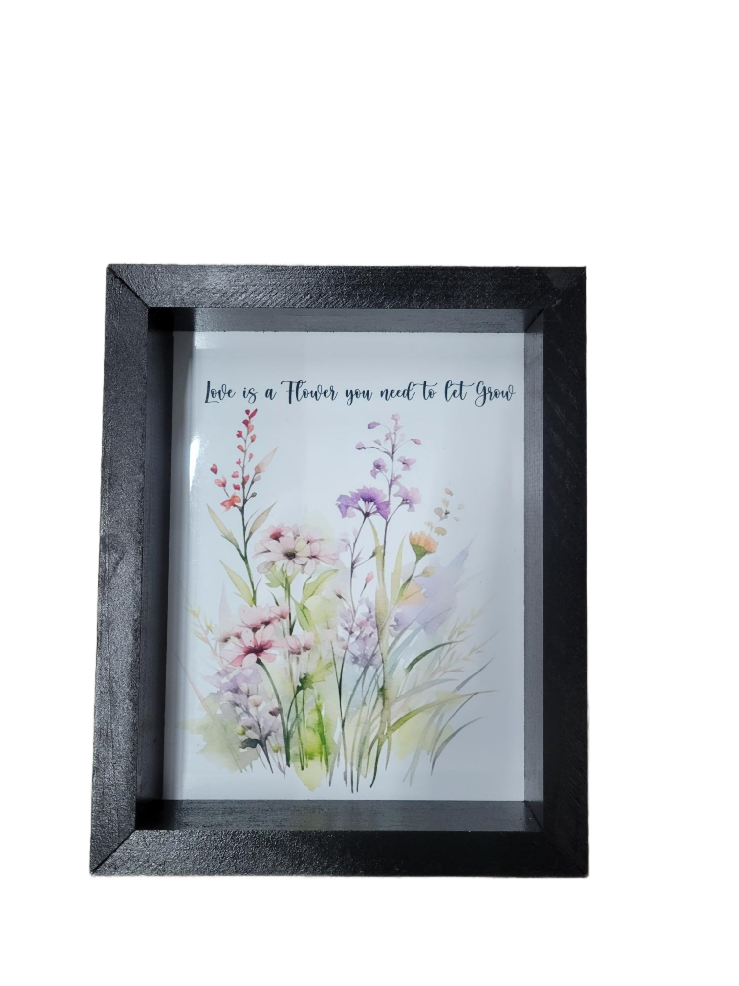 Framed floral wall art with 'Love is a flower you need to let grow' quote. Perfect for home decor, gifts, and adding a touch of nature-inspired beauty