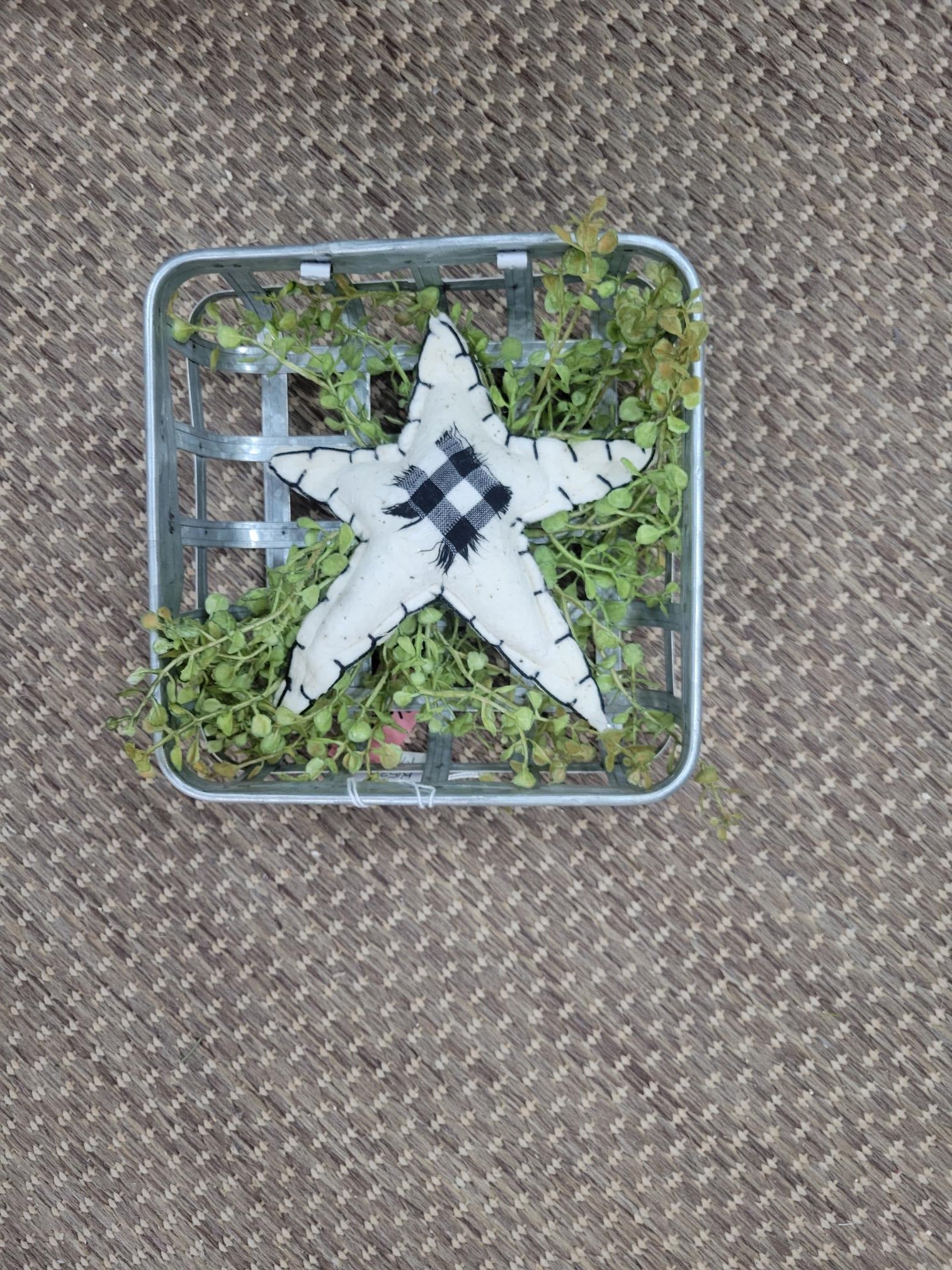 This galvanized metal basket is filled with a handful of greenery. A white fabric star with black stitched edging and a black and white patch in the center. Great Farmhouse Look. Measures 7"x7"x2.5"