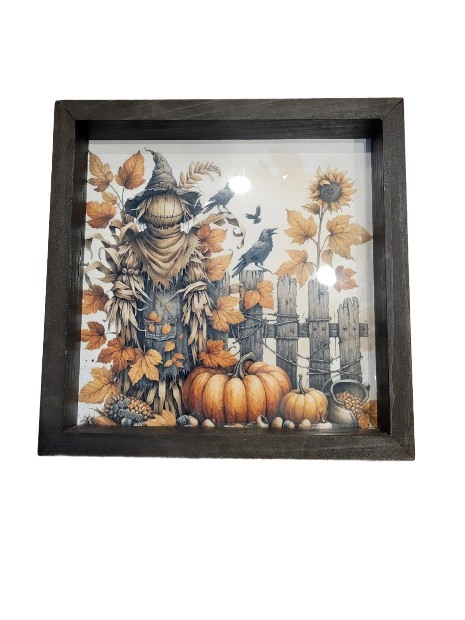 Bring cozy autumn charm to your home with this 12x12 framed scarecrow and pumpkin wall art. Featuring golden leaves, sunflowers, and rustic farmhouse details, this harvest-themed print adds warmth and seasonal beauty to any space. Perfect for fall decorating, farmhouse kitchens, or country entryways.