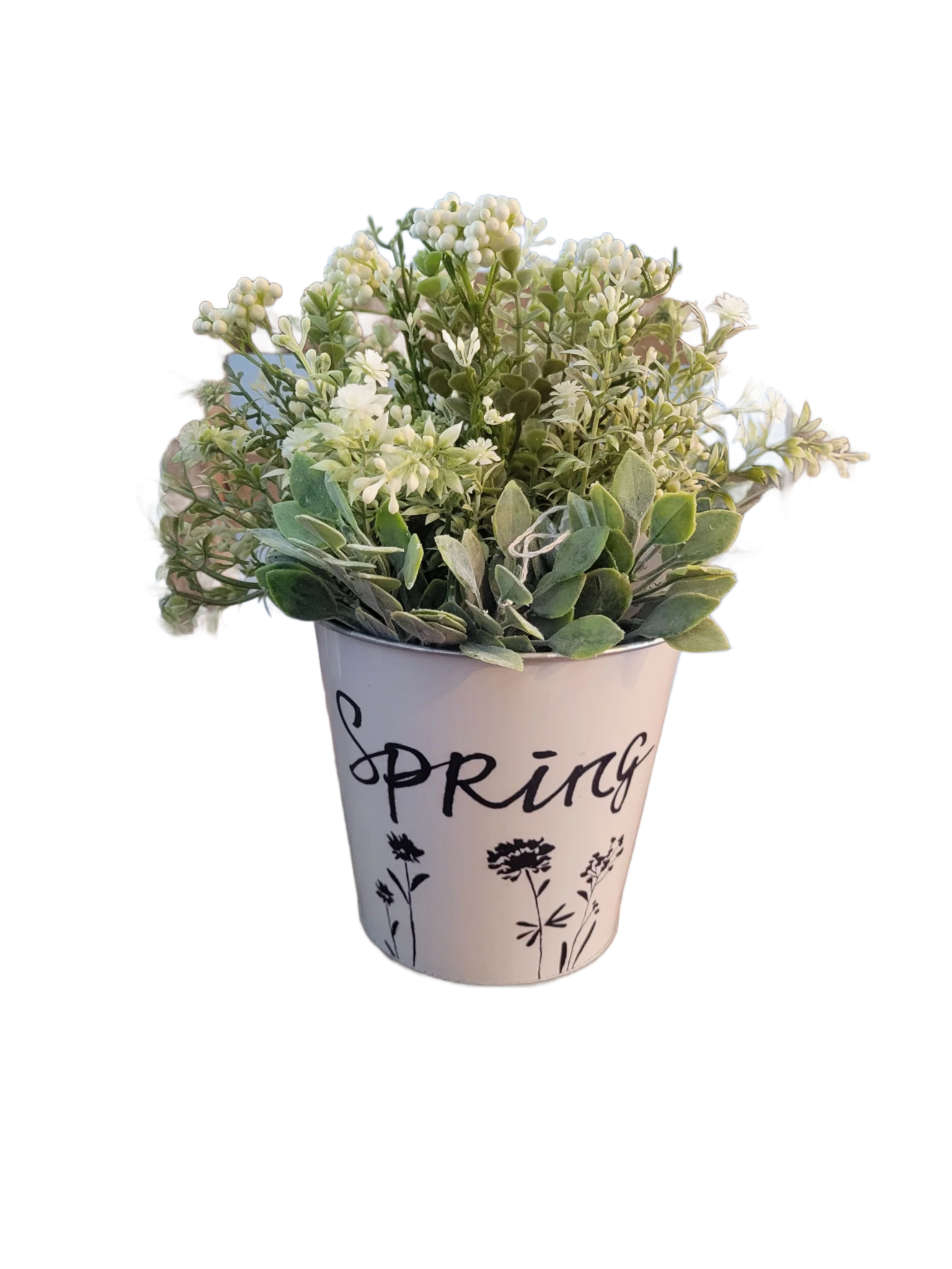 Add fresh seasonal charm to your home with this Spring floral metal planter featuring lush faux greenery and delicate white blooms. The white tin pot is accented with black botanical artwork and elegant “Spring” lettering, making it perfect for farmhouse, cottage, or modern décor. Ideal for shelves, mantels, entry tables, kitchens, or seasonal displays. A low-maintenance decorative accent that brings spring beauty indoors year-round. Measures 5" in diameter and approx. 11" high