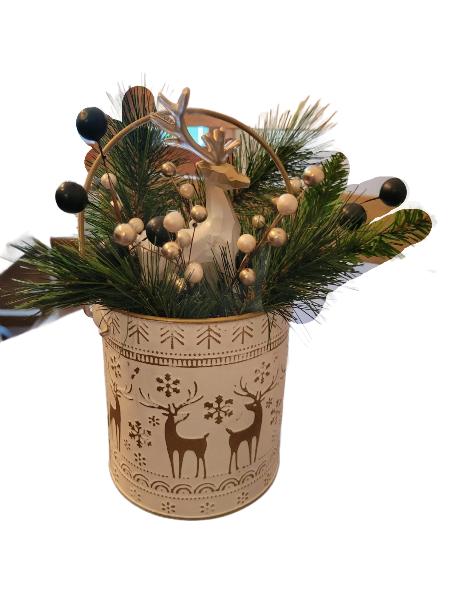 Bring festive charm to your home with this elegant white and gold deer arrangement. Featuring pine greenery, metallic berries, and a winter woodland design, this holiday centerpiece adds a cozy and stylish touch to your Christmas decor. Perfect for tables, shelves, or entryways. Measures 7" x 7" x 12