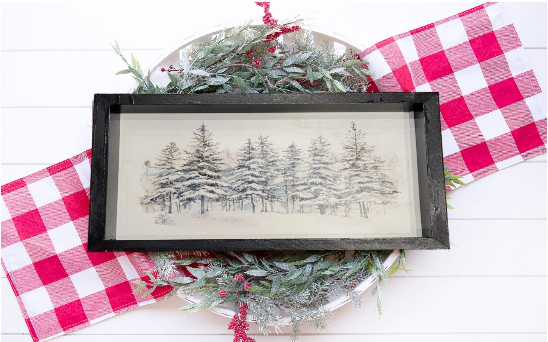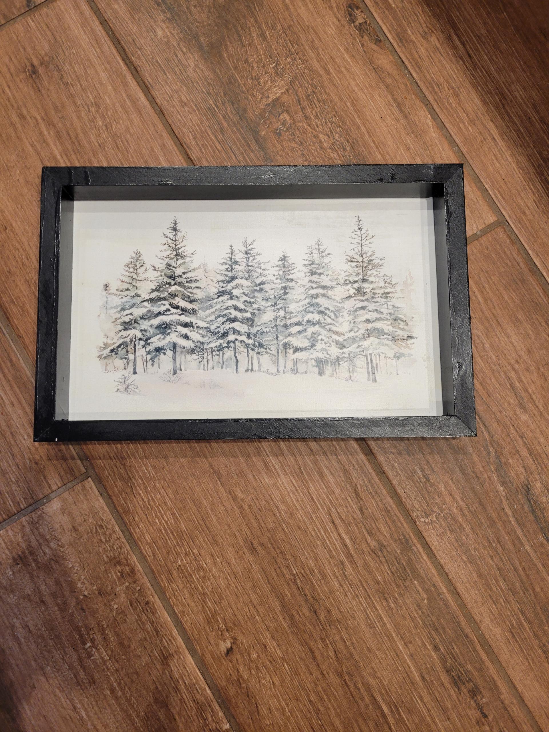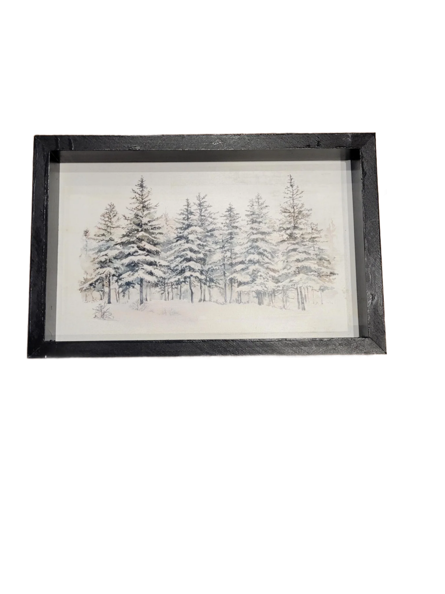 Bring serene winter beauty into your home with this framed artwork of snow-covered pine trees. Perfect for rustic, farmhouse, or seasonal decor, this peaceful forest scene adds a touch of nature's charm to any room. Measures 16" x 10" x 1.5"